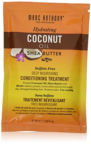 -. Binding : Health and Beauty -. Brand : Marc Anthony -. EAN : 0621732531060 -. Feature : MARC ANTHONY Hydrating Coconut Oil & Shea Butter Deep Nourishing Conditioning Treatment / Marc Anthony Hydrating Coconut Oil & Shea Butter Treatment is a lightweight Oil Treatment that penetrates the cuticle to help nourish and hydrate your hair leaving it smoother and shinier. It protects from splitting and breaking, allowing hair to grow longer, faster. Vitamins A and E found in Shea Butter help to moisturize and nourish your hair. Coconut Oil¿s hydrating properties soothe and soften hair. Biotin helps to promote a healthy hair and scalp. / TRAVEL SIZE / 1.69 FL OZ -. IsAdultProduct : 0 -. Label : MARC ANTHONY -. Manufacturer : MARC ANTHONY -. Model : 53106 -. MPN : 53106 -. PackageQuantity : 1 -. PartNumber : 53106 -. ProductGroup : Beauty -. ProductTypeName : BEAUTY -. Publisher : MARC ANTHONY -. Studio : MARC ANTHONY -. Title : MARC ANTHONY Hydrating Coconut Oil & Shea Butter Deep Nourishing Conditioning Treatment -. UPC : 621732531060