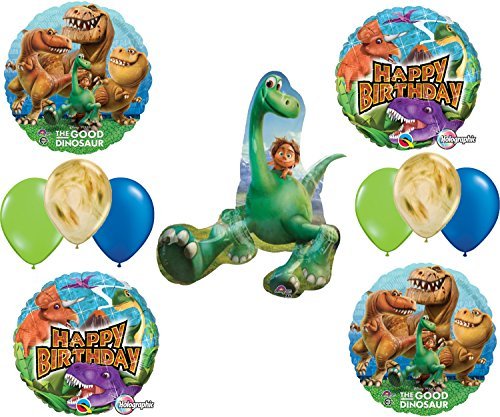 With this kit you will receive: (1) 34" Good Dinosaur Shape Mylar Foil Balloon, (2) 17" The Good Dinosaur Mylar Foil Balloon, (2) 18" Happy Birthday Dinosaur Mylar Foil Balloons, (4) 12" Latex Balloons 2- Lime and 2-blue. Just add Helium and ENJOY!