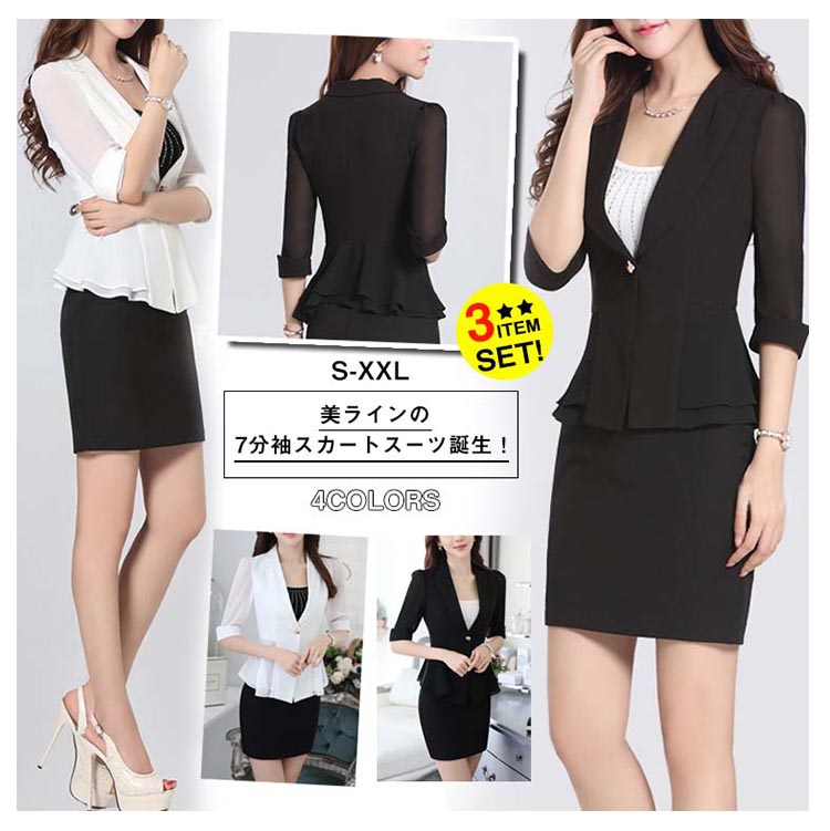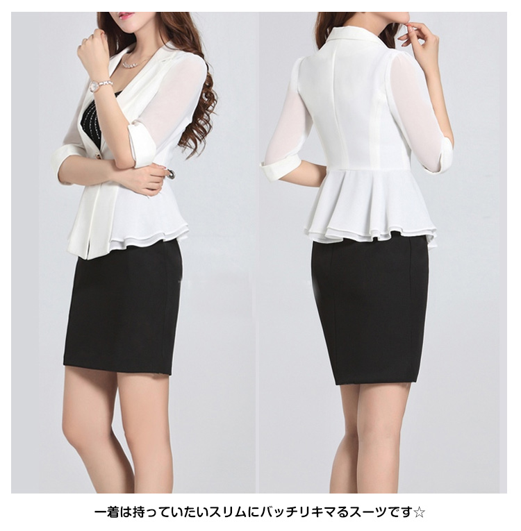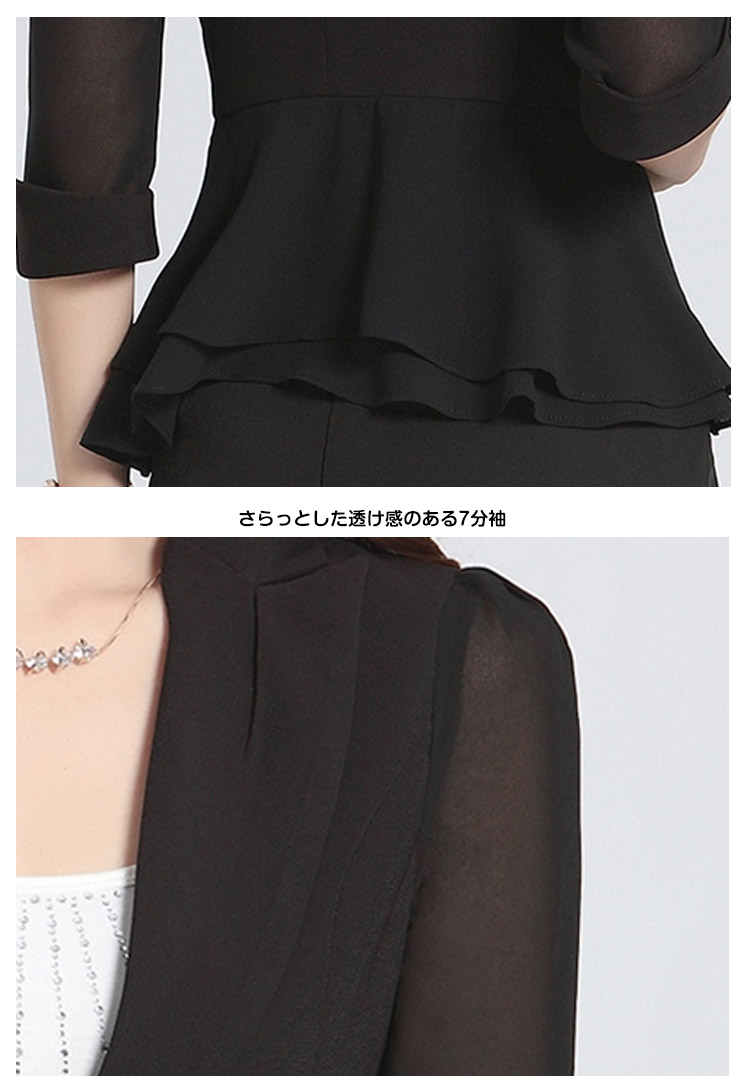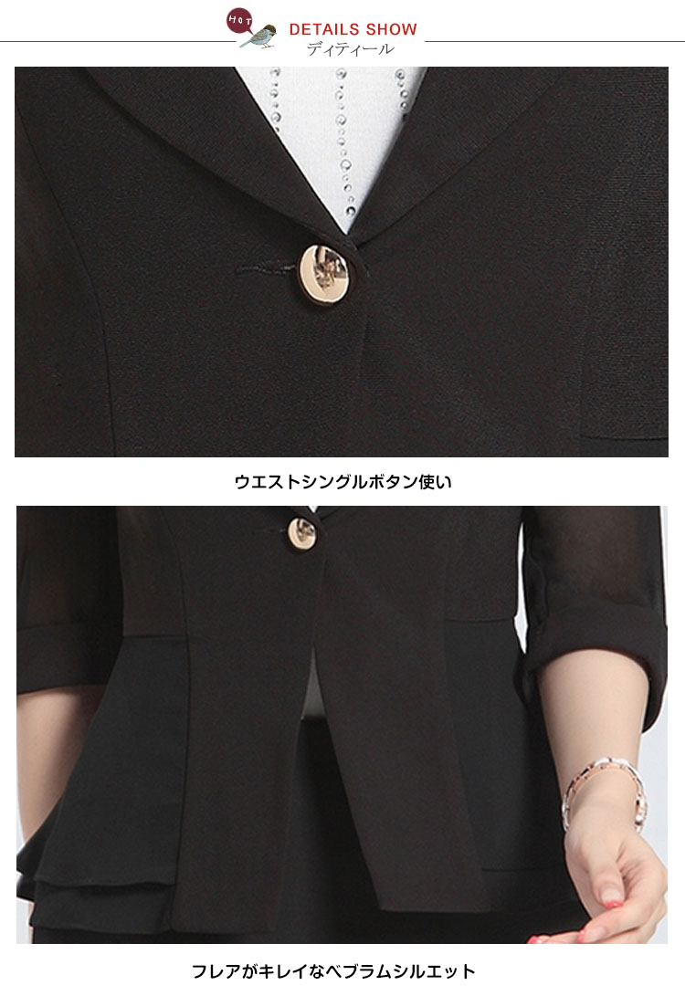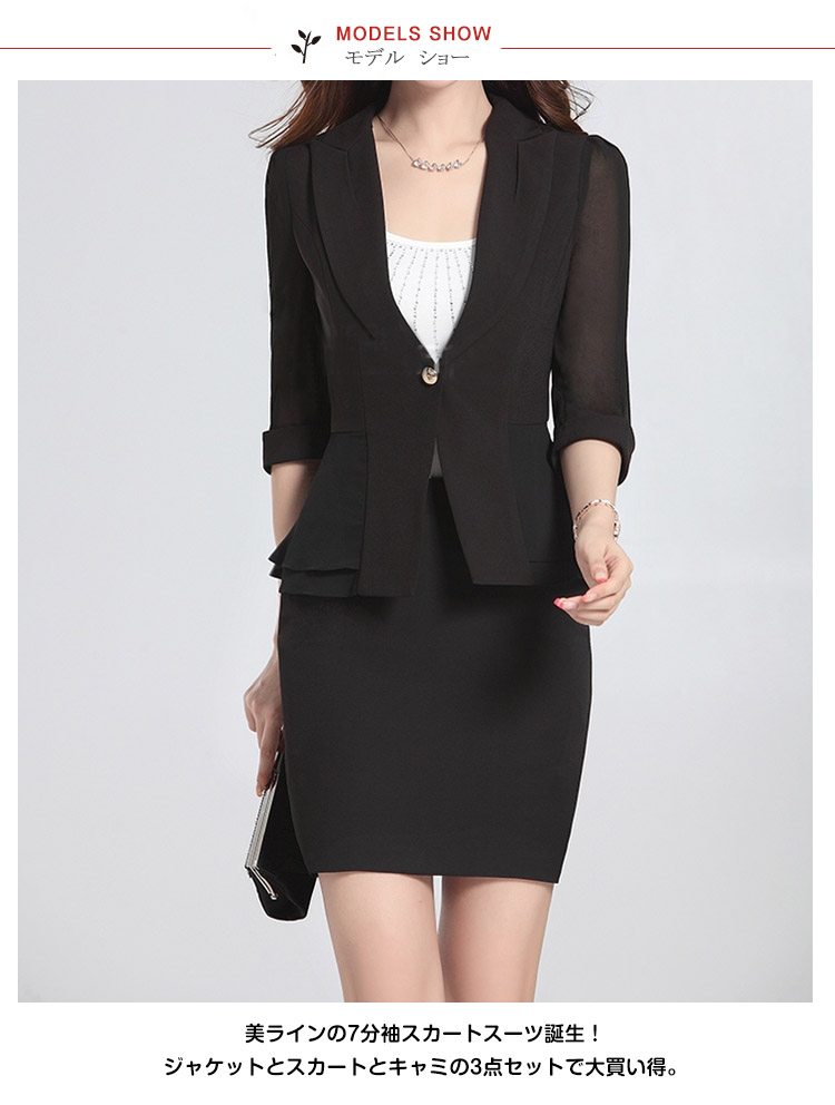 | 美ラインの7分袖スカートスーツ誕生!ジャケットとスカートとキャミの3点セットで大買い得。シッカリとした生地にさらさらシフォンを合わせた異素材切り替えになります。ウエストフレアのペプラムが綺麗シルエットに♪シフォンの生地が清涼感をタップリと表現しオトナの上質感をアップ★ビジネスシーンはもちろん入学式、卒業式、式典などのセレモニーシーンも活躍する事間違いなし!一着は持っていたいスリムにバッチリキマるスーツです☆ | |