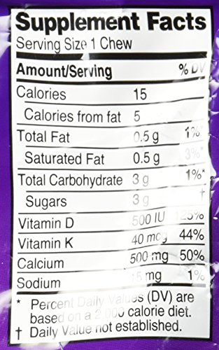 -. Feature : Viactiv Calcium Plus D Milk Chocolate Flavored Dietary Supplement - 180 Chews / Calcium carbonate soft chews / 500mg Calcium / 500mg Vitamin D / 40mg Vitamin K