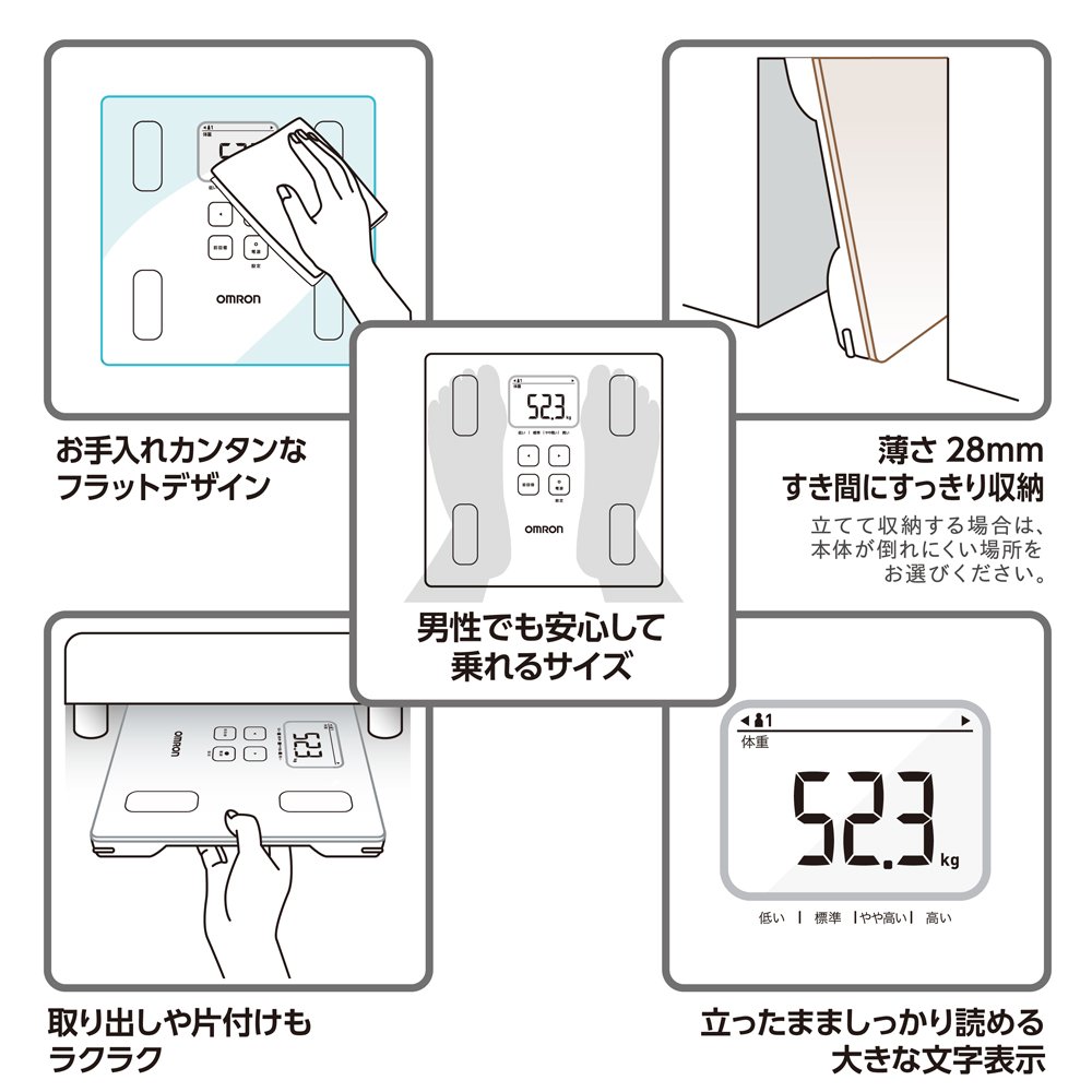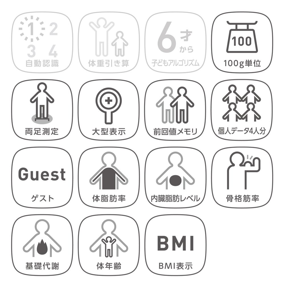 ●表示:BMI、体脂肪率/体脂肪率判定/基礎代謝/骨格筋率/骨格筋率判定/基礎代謝/骨格筋率/骨格筋率判定(対象年齢10才以上80才以下)、内臓脂肪レベル/内臓脂肪レベル判定/体年齢(対象年齢18才以上80才以下)●ポイントメモリ:前回値表示