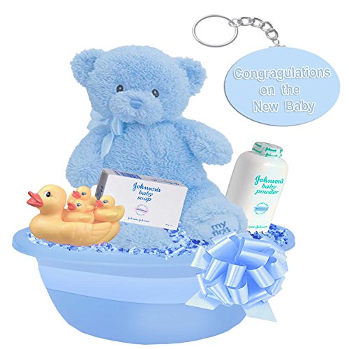 -. Feature : The "Deluxe Baby Gift Basket" make the perfect gift for celebrating a special new little newborn! / It is superbly presented with hand-tied satin ribbons and bows and includes a stunning hand crafted new baby card with your personalised hand written gift message. / Welcome the new baby boy with his first teddy bear! Snled inside our "My First Teddy" Baby Boy Gift Basket is the softest and cutest plush teddy bear in baby blue for boys with "My First Teddy" embroidered on his foot.