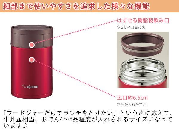 | 象印ならではの保温力を持ったステンレス真空二重まほうびんのフードジャー あったかスープも ひんやりメニューもずっとおいしい温度で楽しめます オフィスでも お出かけでも大活躍 |