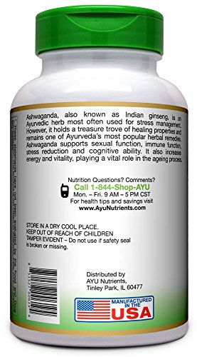 -. Feature : Why AyuNutrients :Ashwagandha supplements on the market were low capsule count or low potency or the use of gelatin (dead cow), yuck! We decided to source the strongest Ashwagandha Extract %8 Withanoids which is therapeutic quality ingredient/clinical strength and sell them at a reasonable P.R.Ice. / Key Benefits: Ashwagandha has an adaptogenic properties which provides multi-functional support for promoting Focus and physical strength, including support for joints,occasional stress,memory, Focus,immune function, and healthy lipid levels and glucose metabolism.* / Supports normal cortisol levels, which control appetite and play a crucial roll in fat metabolism.It strengthens exhausted nervous systems by feeding the adrenal glands that respond to stress and supports recovery after physical exertion by supporting the stress-response organs such as the adrenals for quicker recuperation and recovery from exercise / PURITY: We use only use scientifically-tested ingredients, all of which are manufactured in our US, FDA-inspected, state-of-the-art, facility, with strict adherence to good manufacturing practices. Every batch is third party tested to ensure that we only utilize ingredients that are safe and pure. / Share:Consider ordering one bottle for yourself and another for a friend or loved one. Keep each other motivated and reach your goals together and more quickly. Ayu Nutrients stands by every quality product they make. We manufacture only premium and extra pure but high potency vitamins, capsules, pills, tablets, powders, multivitamins, supplements, topicals liquids, serums, vegan foods, and natural organic-based extracts for men, women, and children. Check AyuNutrients out today!