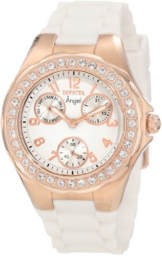 Rose gold-tone watch with crystal-accented bezel featuring white dial with three textured subdials 38-mm stainless steel case with flame-fusion dial window Japanese quartz movement with analog display White silicone band with buckle closure Water resistant to 30 m (99 ft): In general, withstands splashes or brief immersion in water, but not suitable for swimming