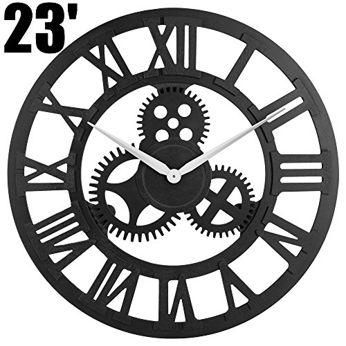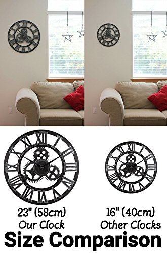 This high quality silent completely noiseless quatz gear clock is handmade wooden wall art. It is a great decor solution for anyone who appreciates an rustic look and feel. The rugged design of oversized, stationary gears were made of hand painted wood. Its hand painted finish is done in aged metallic tones. Requires 1 AA battery (not included). Dimensions include: 23" diameter, 0.55" thick. This one-of-a-kind item gear wall art clock approximately weighs 3 pounds. Only quality materials and manufacturing will do. Product materials: zero noise non-ticking high quality quartz movement, engineered wooden fiberboard, metal (hands). No assembly required - hands fully assembled. 0