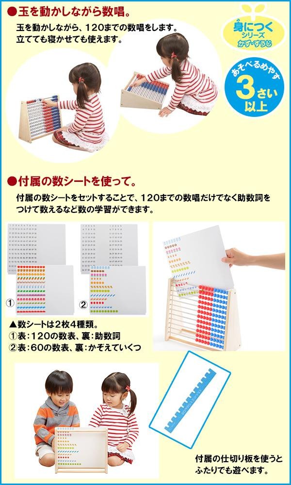 | 120までの数を、玉をはじきながら声に出して数える「玉そろばん」です。くもん独自の「120までの数かぞえ」ができて、数の並びの規則性が理解でき、100を超える大きな数の感覚も身についていきます。付属の厚紙製の「数シート(背板)」を差し替えることで、「助数詞」「かぞえていくつ」などの学習もできます。 |