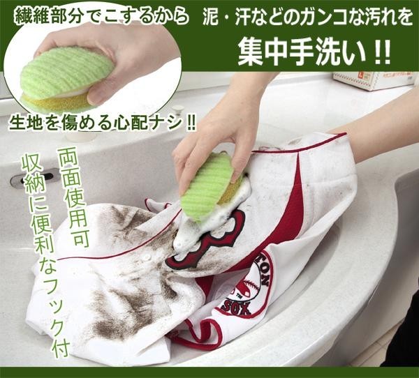 | 汗や泥などで汚れたユニフォームの汚れを集中的にこすって洗う!!専用クリーナーです。クリーナーは両面使用OK。水切りの良いスポンジ(ムマック)を使用しています。繊維部分でこするので生地を傷める心配がありません。収納に便利なフック付♪ |