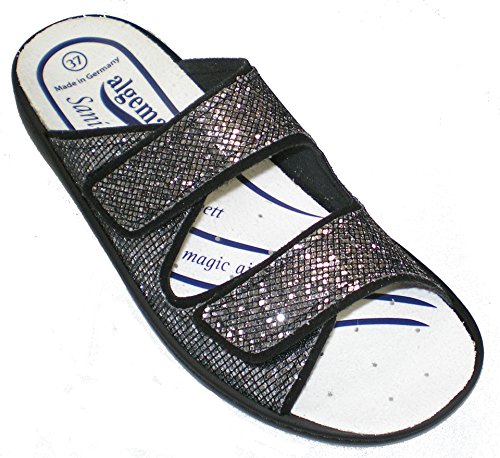 Binding : Apparel Product Description Algemare 3422-0812 Ladies clogs with velcro closure, color: inox / negro, upper: textile, lining: textile, removable insole (also suitable for loose inserts), manufacturer's information: The Sani-pure replacement footbed provides optimal cushioning when performing and supports the Foot during the entire rolling movement. Due to the enormous moisture absorption, a dry foot is always guaranteed. The refinement with an additive from Sanitized AG makes the footbed antifungal, antibacterial and prevents unpleasant odor. In addition, the footbed in the washing machine in a linen bag at 30 degrees washable or can be cleaned with a hand-warm soapy water and a hand brush carefully. 0