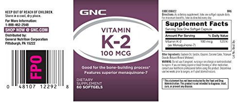-. Binding : Health and Beauty -. Brand : GNC -. EAN : 0048107122928 -. Feature : Good For The Bone-Building Process / Features Superior Menaquione-7 -. IsAdultProduct : 0 -. Label : GNC -. LegalDisclaimer : WARNING: Do not use if pregnant, nursing or are allergic or contraindicated to aspirin. If you are taking aspirin or blood thinning or other medications, consult your healthcare professional before using this product. Discontinue use two weeks P.R.Ior to surgery, or if upset stomach occurs. -. Manufacturer : GNC -. MPN : 096822 -. PackageQuantity : 1 -. PartNumber : 096822 -. ProductGroup : Health and Beauty -. ProductTypeName : HEALTH_PERSONAL_CARE -. Publisher : GNC -. Size : 60 servings -. Studio : GNC -. Title : GNC Vitamin K-2 - 100 mcg -. UPC : 048107122928