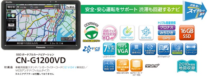 G1200Vには交通情報サービス「VICS WIDE」を搭載。 ビーコンや通信機器なしで、快適な渋滞回避ルートを案内。VICS WIDEの渋滞・規制情報を活用して、より早く快適なルートを自動的に案内します。