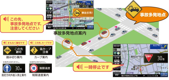 事故が多発している地点をアイコン(オレンジ色)と音声で、一時停止や急カーブなど、見落としがちな道路標識などをアイコン(黒色)と音声でお知らせします。慣れない道でも安心です。