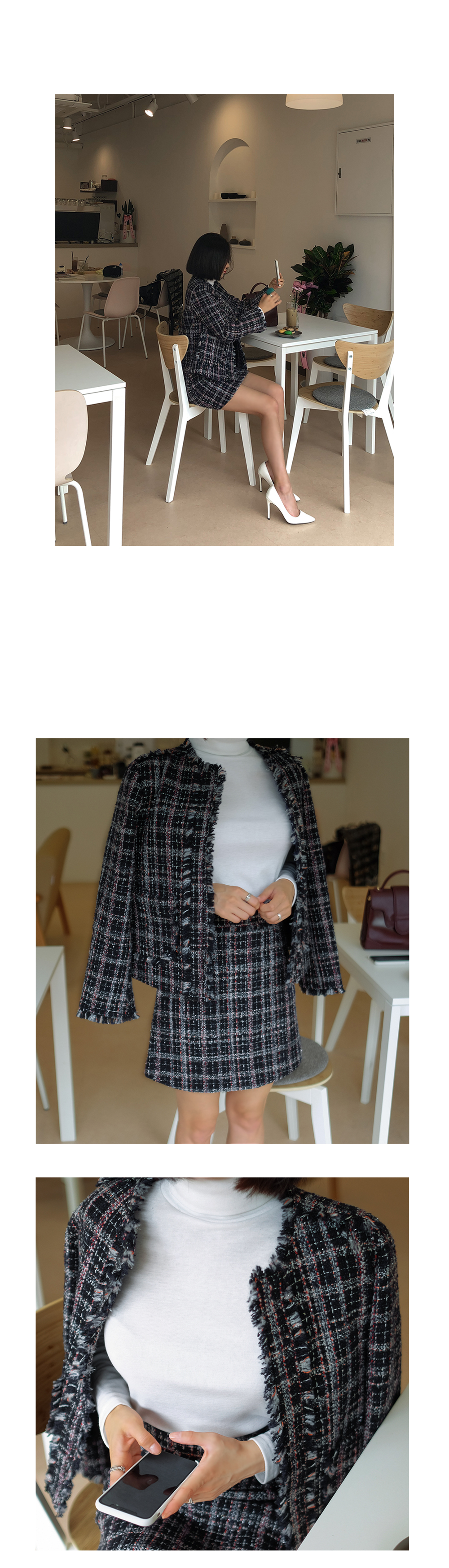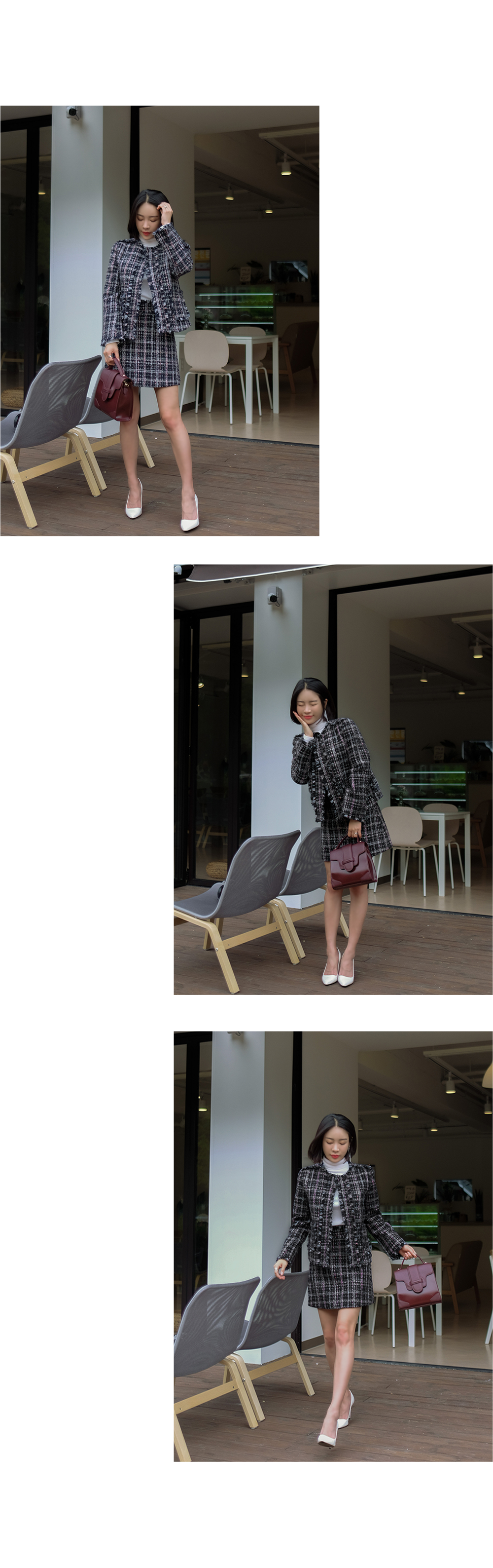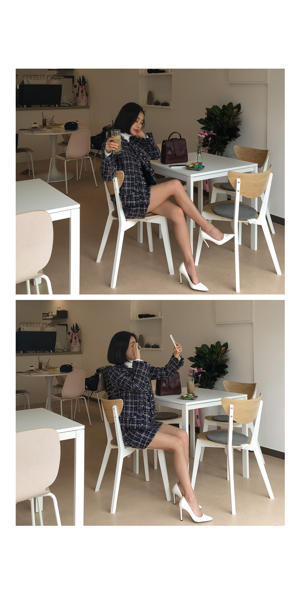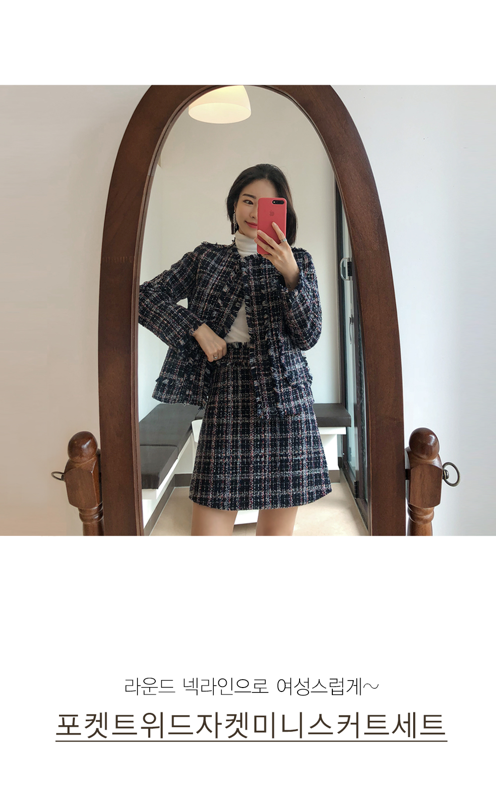 라운드넥라인 자켓과 미니스커트 세트로 한층 여성스러운 룩이 연출되는 아이인데요!