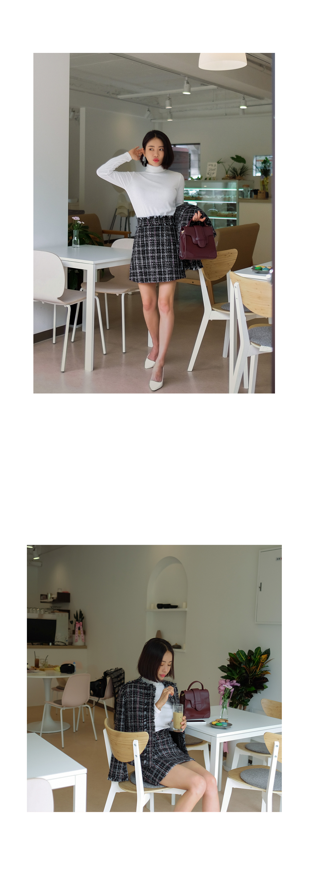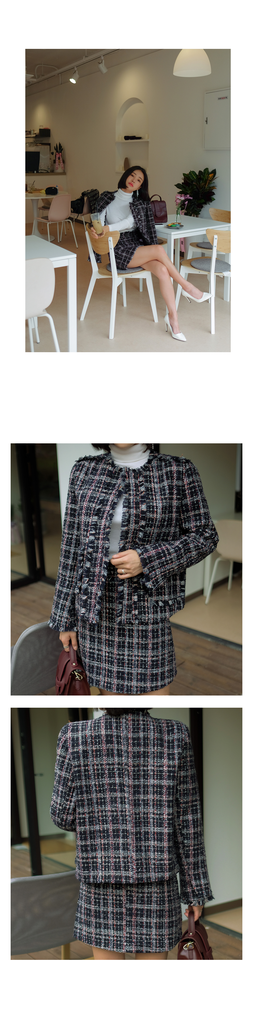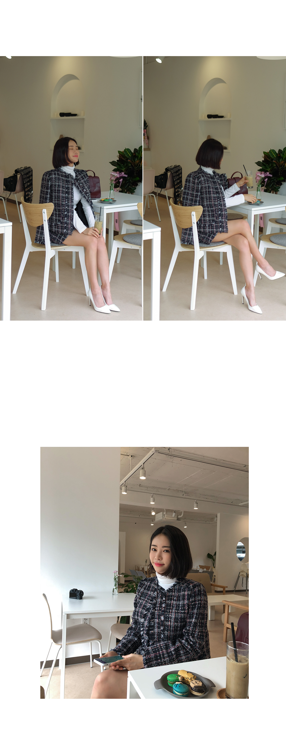 라운드넥라인 자켓과 미니스커트 세트로 한층 여성스러운 룩이 연출되는 아이인데요!
