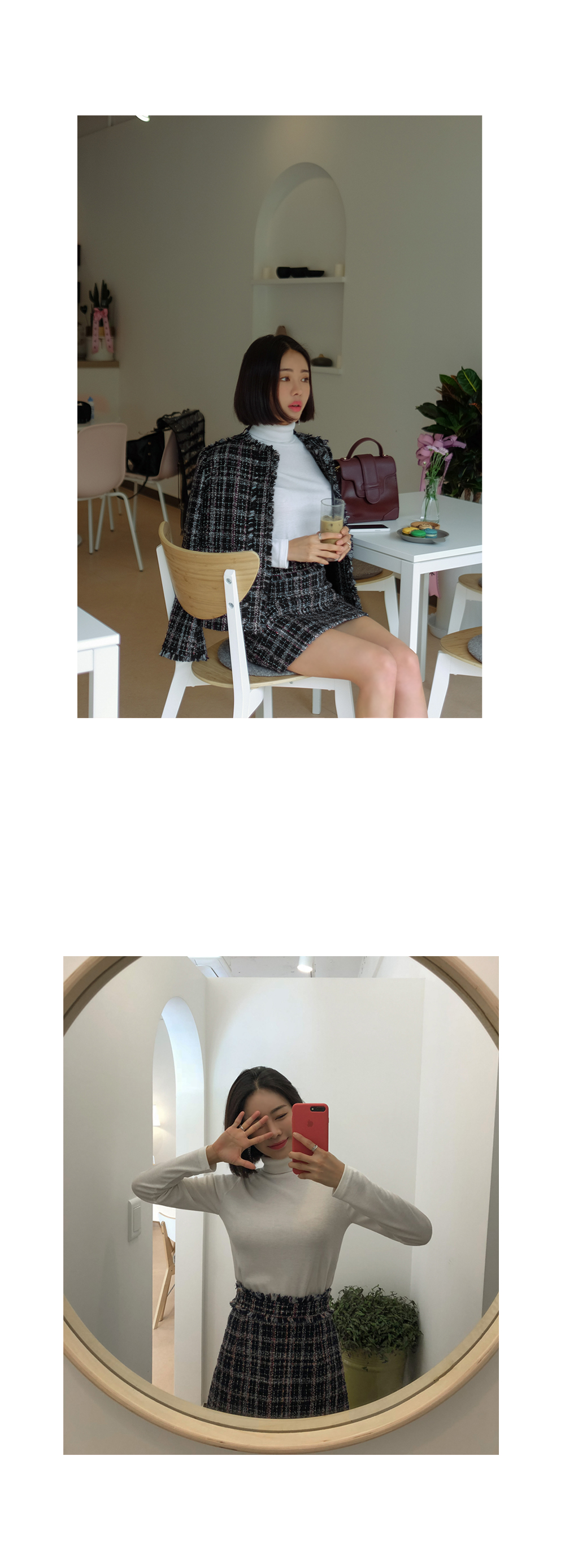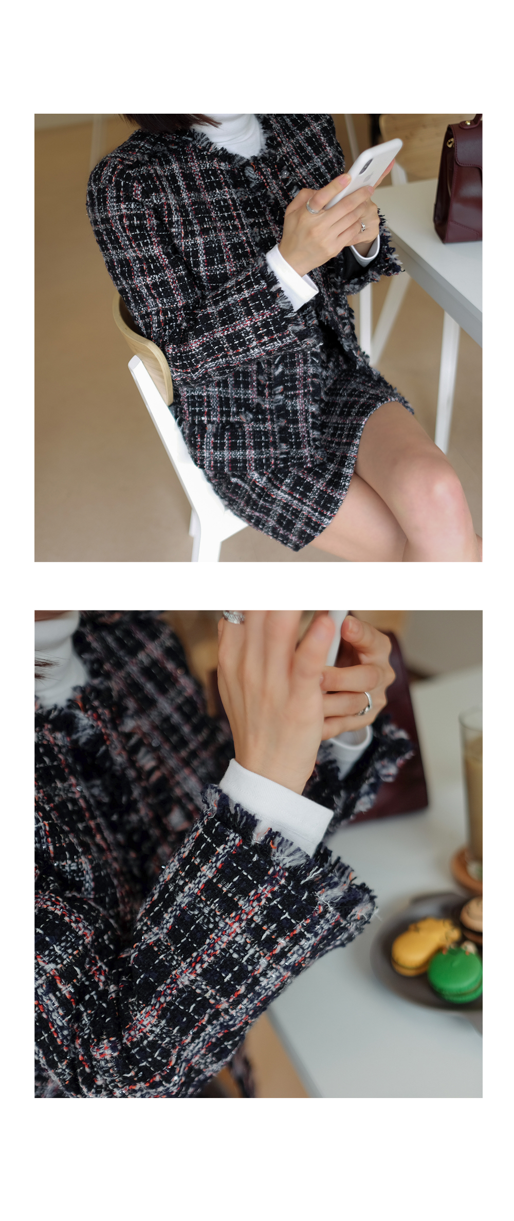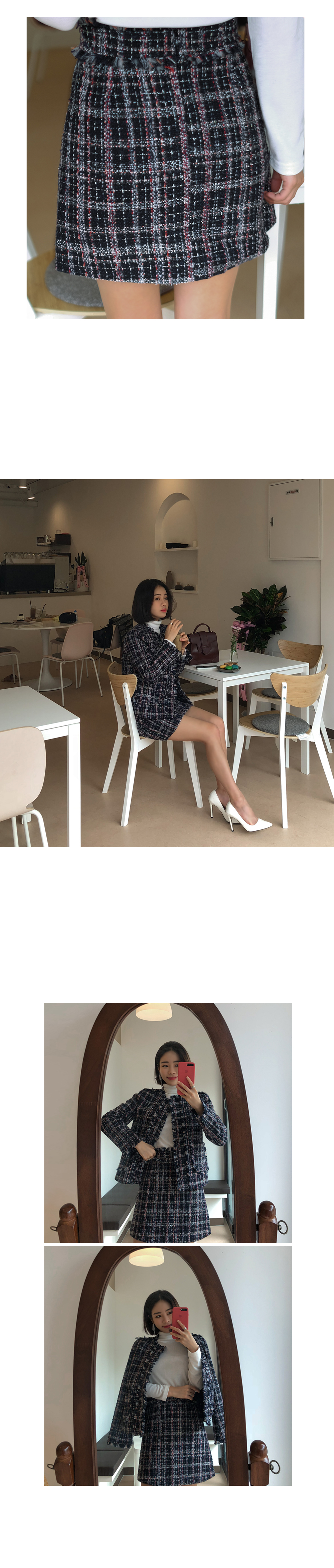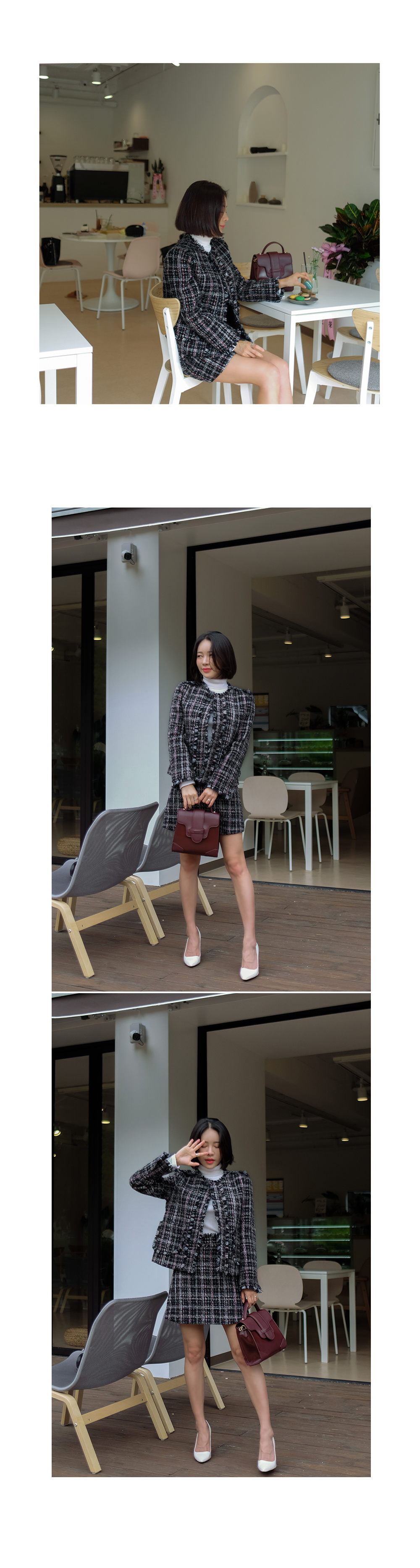 라운드넥라인 자켓과 미니스커트 세트로 한층 여성스러운 룩이 연출되는 아이인데요!