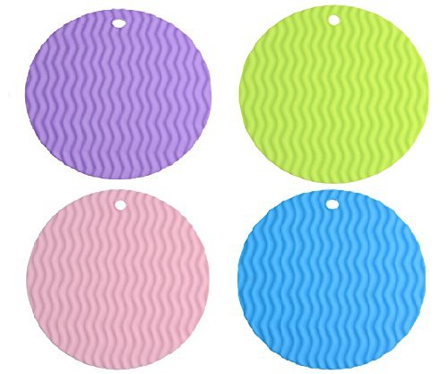 Round Silicone Wave Design Trivets - Multi-purpose Silicone Pot Holders, Spoon Rest and Kitchen Table Mat-Insulated, Flexible, Durable, Non Slip Hot Pads (Pack of 4 Pieces - Blue, Purple, Pink, Green)