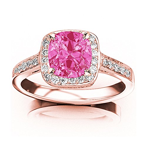 -. Title : 0.73 Carat t.w 14K Rose Gold Classic Square Halo Single Row Pave Set Diamond Engaement Ring w/ a 0.5 Carat Cushion Cut Pink Sapphire Heirloom Quality
