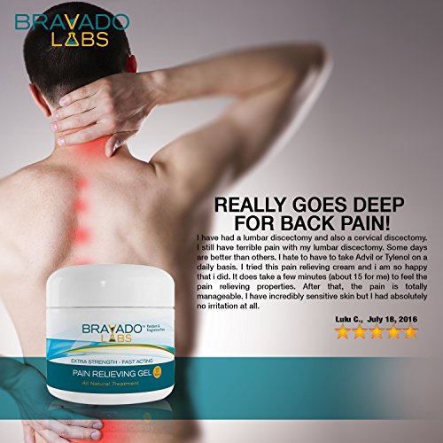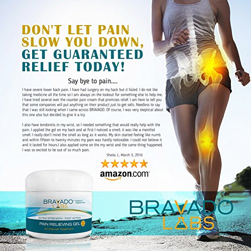 -. Feature : TOPICAL PAIN RELIEF Suffer through joint pain, backaches or carpal tunnel? Our pain relief gel cream is all you need for instant relief from acute or chronic conditions! In less than 20 minutes, the gel takes full effect, allowing you to forget pain and get on with your life. / LONG LASTING SUPPORT Loaded with anti-inflammatory ingredients, the powerful effects of our gel can last for 4-8 hours! Whether you use it for sciatica pain relief, as arthritis cream, or for other discomforts, it works to reduce swelling, taking pressure off nerves. / ALL NATURAL BLEND When it comes to pain management, most creams are filled with harsh chemicals and foul odors. But thanks to our potent blend of all natural ingredients, our gel is safe for users of all different skin types and absorbs fast to target pain at the source. / PREMIUM QUALITY Heavily researched, expertly crafted, and manufactured in the USA, we went above and beyond to create a high quality, effective gel you can rely on! It's also cruelty, paraben and fragrance free for a non-irritating formula that brings real results. / SATISFACTION GUARANTEE The Bravado Labs team wants to help you feel better than ever. When you shop with us, you'll receive our risk free 90-day money back guarantee. If you're not completely satisfied, we'll fully refund your purchase - no return necessary!