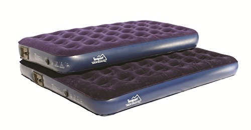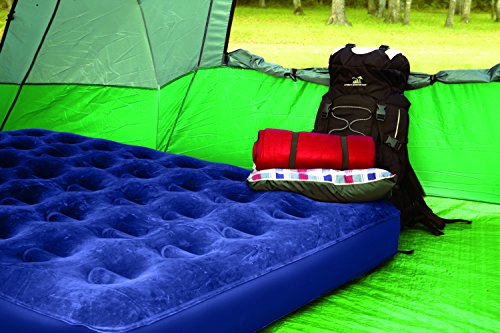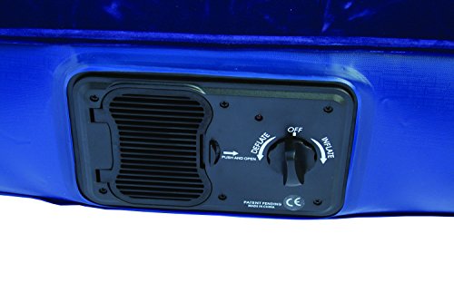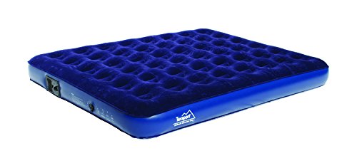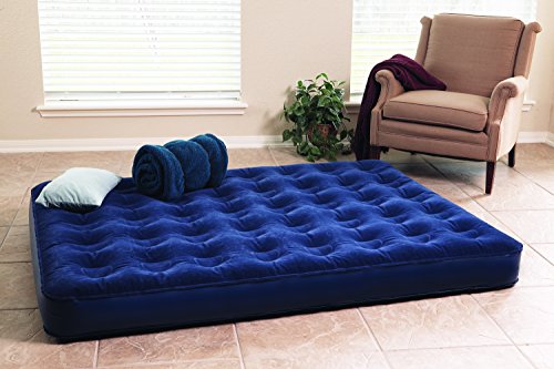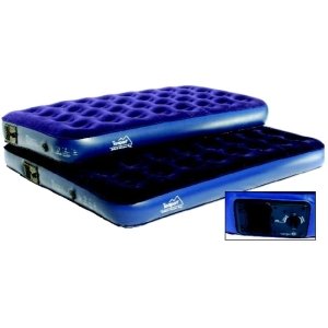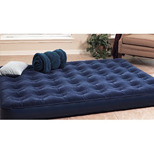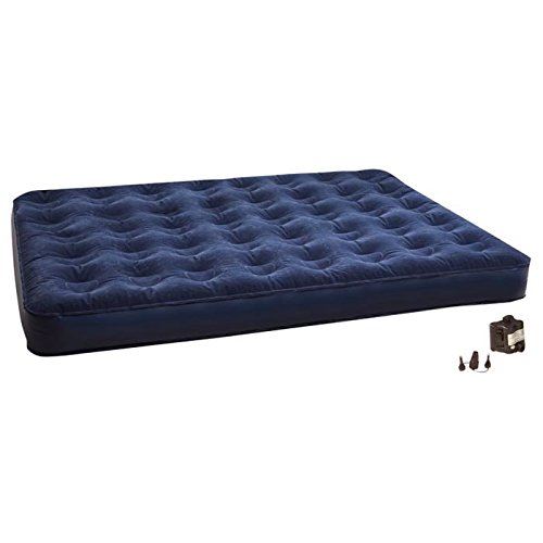 Amazon.com Featuring a built-in battery-operated pump, this queen air bed has a soft, navy-blue velour top surface and is made of extra-heavy PVC for durability. The pump uses 4 D batteries (not included), and the bed has an easy-flow valve system. The pump can be removed from the bed and used independently. Coil-beam construction ensures the bed is comfortable. Designed for home or camping, it measures 78 inches x 60 inches x 6 inches high. 0