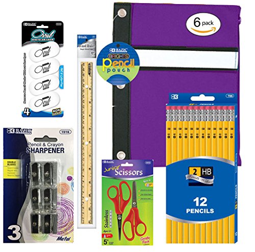Package Includes: 12 #2 Yellow Pencils, 1 Pencil Case Pouch (Colors May Vary), 4 White Erasers, 3 Double Metal Pencil & Crayon Sharpeners, 1 12" Wood Ruler & 2 Stainless Steel Colored Scissors (1 Blunt Tip & 1 Pointed Tip - Colors May Vary) - Total 6 Items / 23 Units