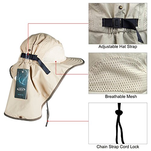 Professional Fishing Hat: Large (unfolded: 20.47(L) x 13(H) inches) and long Bill Flap, protecting your neck and ears. There is a button on it, which can be fastened up to the button on the back of the hat.