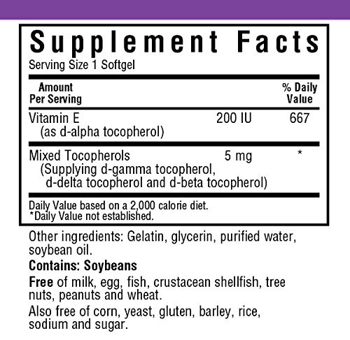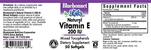Bluebonnet's natural vitamin e mixed soft gels provide the popular, natural d-alpha tocopherol with a full spectrum of natural tocopherol isomers (beta, delta and gamma) in a base of vegetable oil (i.e., soy). Available in easy-to-swallow soft gels for maximum assimilation and absorption. Vitamin e is a powerful, fat-soluble antioxidant that helps protect cell membranes against damage caused by free radicals and prevents the oxidation of ldl cholesterol. It is necessary for the structural and functional maintenance of skeletal, cardiac, and smooth muscle. It also assists in the formation of red blood cells and helps to maintain stores of vitamins a and k.Feature