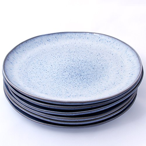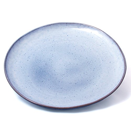 Studio : Trois Voyageurs Publisher : Trois Voyageurs Product Description These sturdy ceramic dinner plates will provide a striking and one-of-a-kind accent to the dinnerware in any home. The glaze is light blue with speckles. You can also find matching sets of six 6" blue speckled cereal/soup bowls and six 9" individual pasta bowls from Trois Voyageurs listed separately on Amazon - bought together, they form an 18-piece dinnerware set. The plates are proudly hand crafted and hand painted by skilled artisans in Portugal. They are made from natural stoneware clay and a nontoxic reactive glaze finish. They have an extremely low porosity (0.3%), which helps prevent chipping and cracking. Perfect Dimensions The plates are approximately 11" (28.5 cm) in diameter. Dishwasher, Oven, and Microwave Safe The plates are dishwasher safe, but you will also find that they can easily be cleaned by hand.?Avoid using abrasive cleaners (steel wool, steel wire scrubbers, etc.). They are oven safe to 535 degrees Fahrenheit (280 degrees Celsius). As with all ceramic and glass dinnerware (including earthenware, stoneware, porcelain, and Pyrex), extreme thermal shocks of 375 degrees Fahrenheit (190 degrees Celsius) should be avoided. That is, they should not be subjected to extreme increases or decreases in temperature, when, for example, placed directly in the oven from the refrigerator or freezer, placed directly on a stove, or removed from a hot oven and placed on a wet countertop. 0