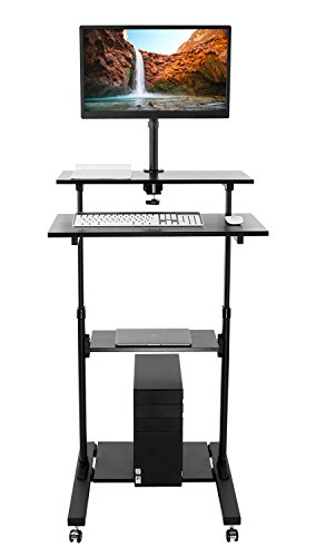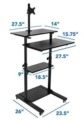 -. Feature : HEIGHT ADJUSTABLE - Ergonomic mobile stand up desk computer workstation is height adjustable from sitting to standing. The desk also comes with a premium monitor mounting arm to raise your computer screen. / STAND-UP PORTABLE DESK - Ideal for use as a stand-up portable computer office desk and can also be used as a speaker's podium. / AMPLE ROOM - Rolling computer cart has 4 platforms to store monitor, laptop, keyboard, printer, CPU, PC tower and speakers. The height of top two shelves are optimized for ergonomic laptop/keyboard and monitor placement. / HEAVY-DUTY - Standing computer cart has a weight capacity of 132 lbs, with about 33 lbs capacity for each shelf. The top two platforms are height adjustable up to 17 inches with 11 locking intervals. / PORTABLE - Moving the desk from room to room is easy with the 1.5 inch furniture casters, and the desk locks into place with two locking brakes.