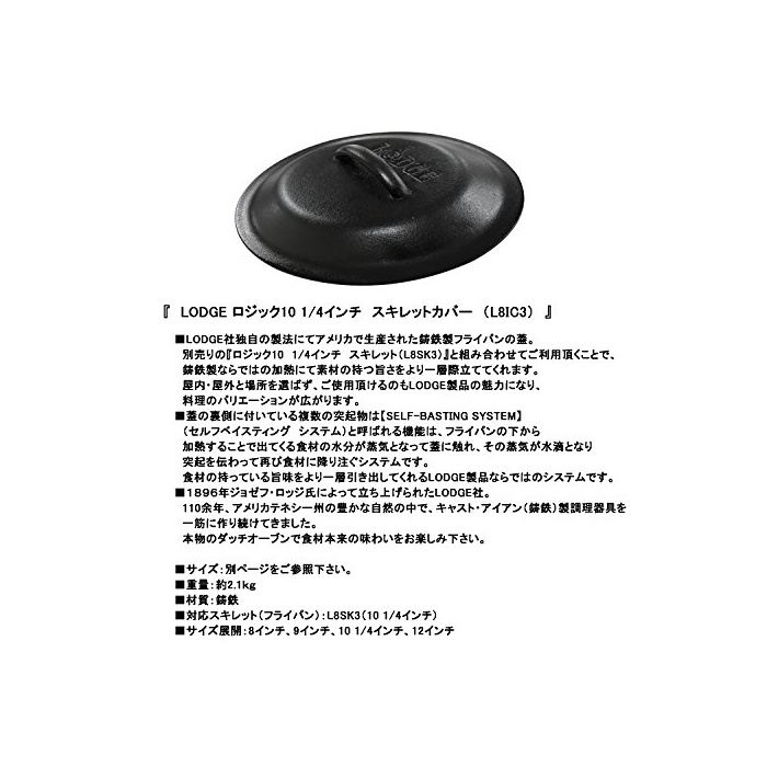 ●사이즈:직경 약26cm ●중량:약2.1kg ●재질:주철 ●대응 스키렛트(후라이팬요리)(프라이팬):L8SK3(10 1/4인치) ●사이즈 전개:8인치,9인치,10 1/4인치,12인치