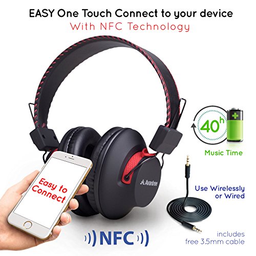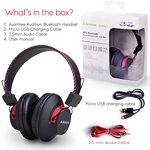 -. Binding : Wireless Phone Accessory -. Brand : Avantree -. Feature : NO AUDIO DELAY: LATEST aptX low-latency technology eliminates "lip sync lag" when paired with low-latency transmitter (e.g. Avantree Saturn Pro and P.R.Iva II). Perfect for games, TV (esp. live) & more. / SUPERIOR Hi-Fi SOUND: Experience superb music and voice clarity. Built-in bass boost lets you tailor audio to your gaming, music or TV preferences with rich lows and clear treble. / LONG BATTERY LIFE & DUAL MODE: Up to 40 hours of music time, with clear voice-prompt status indication. Also can be used as wired headphone without battery consumption / COMFORTABLE & SUPER LIGHT: Super soft pads and adjustable headband provide lasting comfort. / EASY TO USE: NFC for one tap connect. Intelligent voice prompts for status indication. Auto-reconnect to any device -. Label : Avantree -. Manufacturer : Avantree -. PackageQuantity : 1 -. ProductGroup : Wireless -. ProductTypeName : WIRELESS_ACCESSORY -. Publisher : Avantree -. Studio : Avantree -. Title : Avantree DEEP BASS Bluetooth Over Ear Headphones | with 3.5mm Audio In | Wireless or Wired | Easy Pair with NFC | 40h Music Time | Super Comfortable