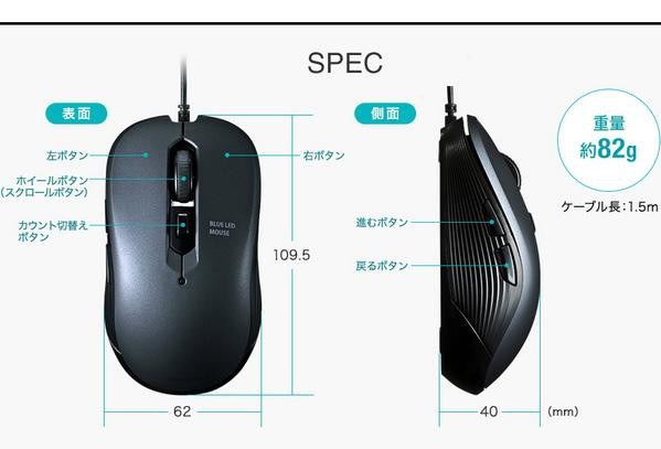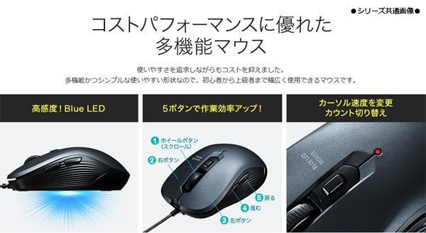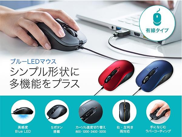 多機能ながらシンプルデザインの5ボタン有線ブルーLEDマウス。差し込むだけで使える手間なし簡単接続です。面倒なソフトのインストールが不要です。