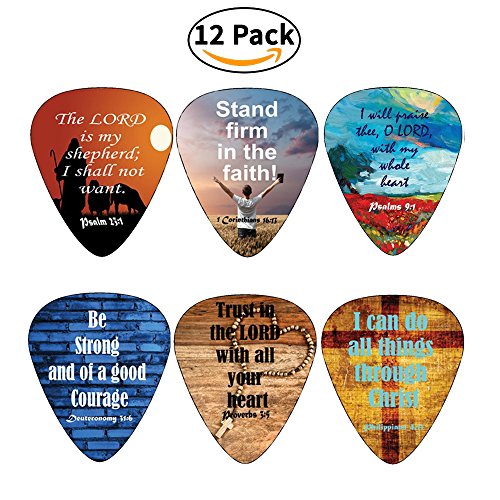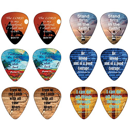 Christian Guitar Picks with Popular Bible Verses -12 Pack Celluloid Medium - Cool Acoustic and Electric guitar Accessories - Unique Gift for Men and Women Guitarists - Best Stocking Stuffers