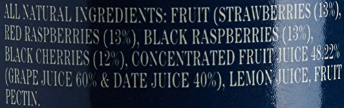 -. Feature : Strawberries, Red Raspberries, Black Raspberries, Cherries, Concentrated Grape Juice, Fruit Pectin, / GMO Free / All natural ingredients. 100% fruit. An old French recipe. No cane sugar. A delicious fruit spread m