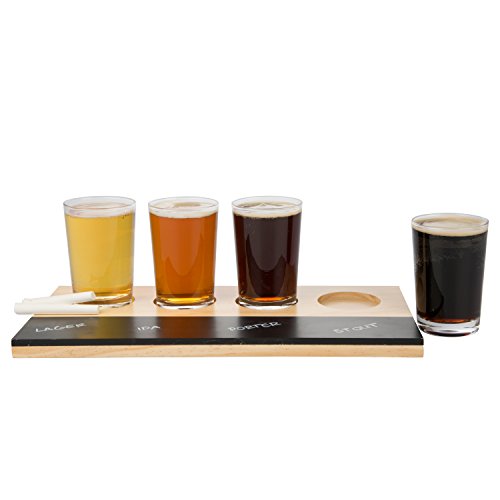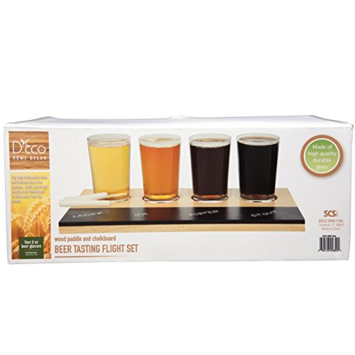 Studio : D'Eco Publisher : D'Eco Product Description This D"Eco beer flight set is excellent for sampling small quantities of a variety of different brews. It's great for parties or times when you only want a small glass of beer. The complete set contains four 6 ounce pilsner glasses, measuring 3-7/8" tall and 2.5" in diameter and one wood carrier, measuring 6-3/8" by 13". It's a great bachelor, housewarming, or host gift, as -well as an excellent addition for the beer lovers collection. Glasses are dishwasher safe, Wood flight is made in hand wash only. 0