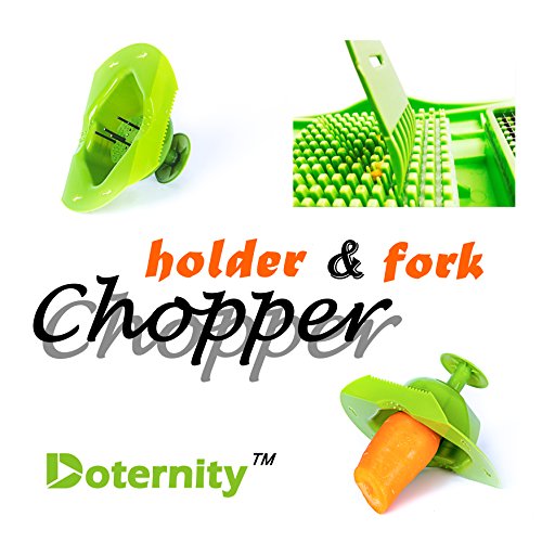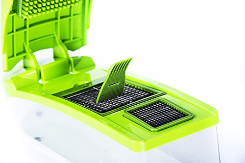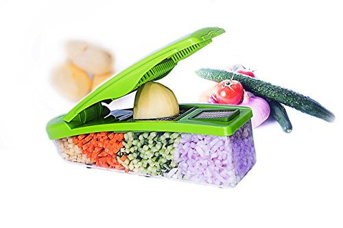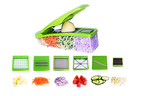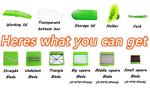 BEST & INTIMATE DESIGN - 6 in 1 Vegetable / fruit cutter, chopper/dicer (big/middle/small cubes) , slicer, julienne slicer, cheese / vegetable grater (coarse / fine grating) within 6 interchangeable blades.There is a safety holder which can protect your hands from cutting when you want to shred or slice. Matching a storage lid if there’s vegetable/fruit lefting ,It can be stored in the box by using this lid.A button in the working lid and a fork help clean the remains in the groove.