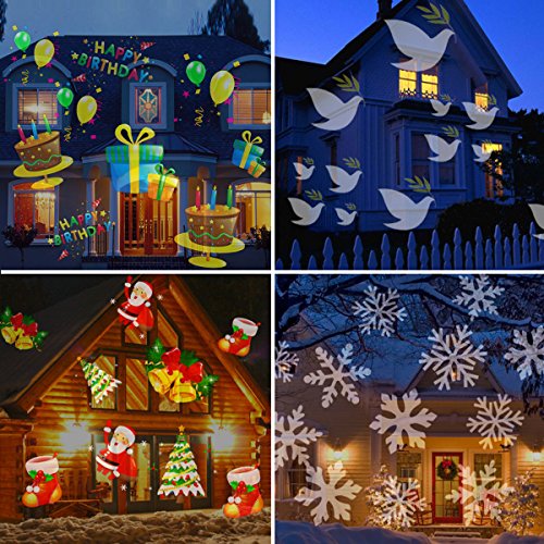 - UNIQUE HOLIDAYS LANDSCAPE PROJECTOR LIGHTS: 12pcs SWITCHABLE PATTERN LENS INCLUDED Snowflake, Halloween theme, Christmas theme, Birthday theme, Love theme, Female Theme, Children theme, Maple Leaf, Four leaf clover, Peace Dove, Clown, Star for Christmas/Halloween/Birthday/Party to create atmosphere instantly