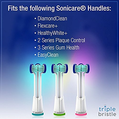 -. Feature : IT'S ALL ABOUT THE BRUSH HEAD - The Triple Bristle replacement brush head for Sonicare® is a game changer. Our 3 sided brush surrounds your teeth to clean all surfaces at one time. Our perfect 45 degree angles sweep away plaque at the gum line and leave your teeth feeling like you just left the dentist office. / DENTIST CREATED AND DENTIST APPROVED - A lot of brushes can say they are dentist approved. Our brush was CREATED by a 3rd generation dentist with a real passion for making a change in the world's health through oral care. / GREAT FOR CAPS, BRACES, VENEERS, IMPLANTS & SENSITIVE TEETH - Soft DuPont® Nylon bristles gently clean your teeth and gums using the sonic vibration of your toothbrush handle. People with braces love how our brush cleans even the tiniest nook. / REPLACEMENTS FOR PHILIPS® SONICARE® TOOTHBRUSHES - You already have a great toothbrush handle. Doesn't it make sense to pair it with the best toothbrush head you can buy? / REDUCES LEVELS OF PLAQUE, GUM SORENESS AND BLEEDING - Our DENTIST RECOMMENDED Soft Brush is safe for braces, implants and dentures. Easy to use 3 Bristle Head is perfectly angled to give THE BEST clean possible. The quadrant timer and ultimate heads cleans every crevice, helps remove stains and bacteria while helping you keep fresh breath and white teeth that are free of gingivitis.