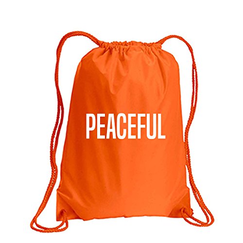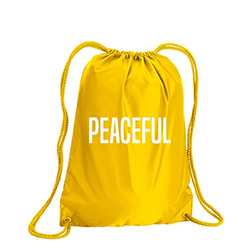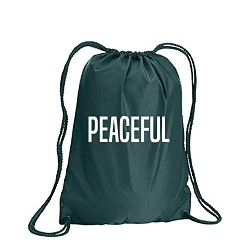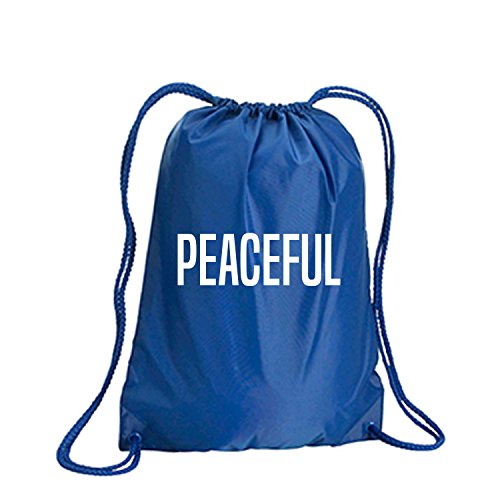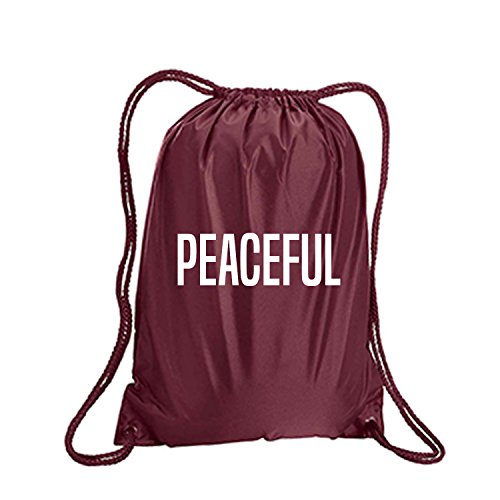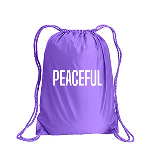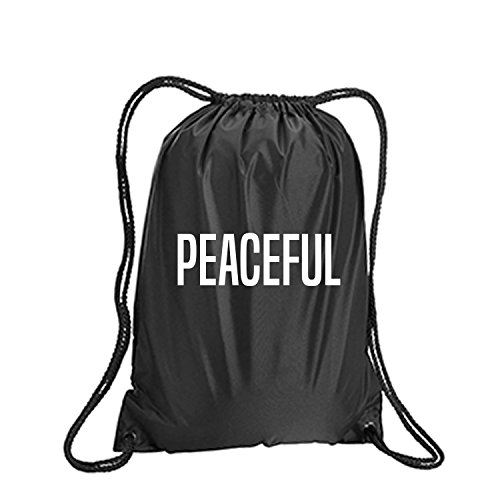 Product Description This durable and stylish nylon tote features "PEACEFUL" on a cinch pack tote with white ink. Bag comes in small and large sizes and is made of a durable 210 Denier nylon and has color-matched draw cords. Printed in the USA on an imported bag. 0
