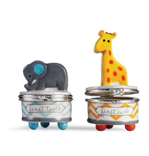 -. Feature : hinged ceramic tooth and curl boxes / hand painted - slight variations may occur from what you see in the picture / elephant is approximately 2-1/2" high; giraffe is approximately 3-1/4" high / comes in an acrylic box for giving / great baby gift