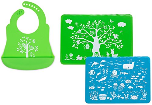 BRINWARE 'FOREST AND SEA FRIENDS' SILICONE PLACEMATS AND BIB WITH POCKET SET