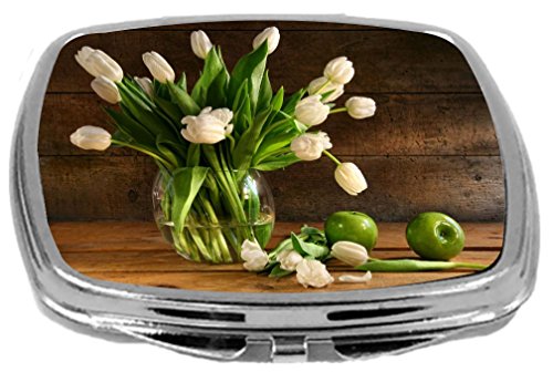 Rikki Knight Compact Mirror, White Tulips in Glass Vase on Rustic Wood with Green Apples, 3 Ounce