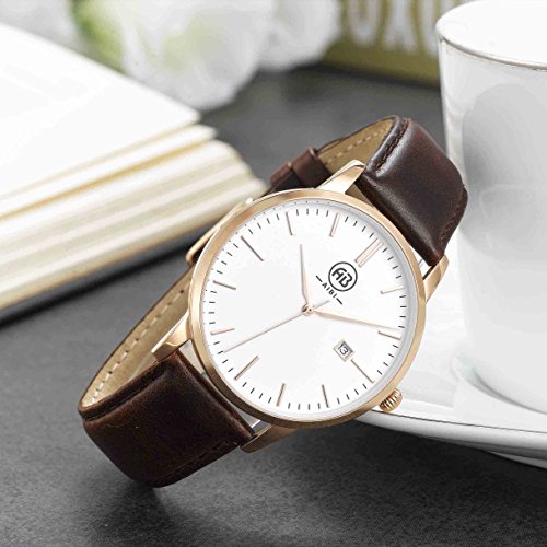 Luxury rose gold frame and stick indexes,leaf-style hands,Brown leather wristband and white dial with date,Japanese quartz movement with analog display