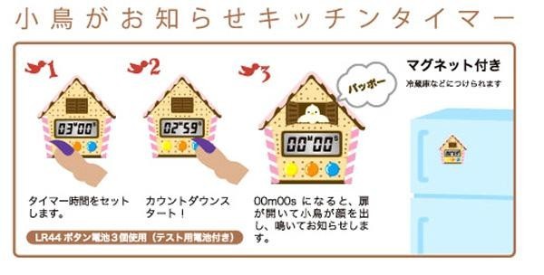 | 小鳥が時間を教えてくれるキッチンタイマーです。タイマー時間をセットし、カウントダウンスタート!時間がくると「パッポー」と小鳥が顔を出して鳴いてお知らせしてくれます。マグネット式ですので冷蔵庫などに取り付けが可能です♪ |
