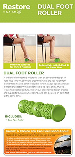 ReleaseDate : 2014-09-02 Studio : Gaiam Publisher : Gaiam Binding : Sports Product Description Ease tension, stimulate blood flow and provide relief from plantar fasciitis and other foot pain with Gaiam Restorer's Dual Foot Massage Roller. Two massage options include a directional pattern that enhances blood flow and a muscle-releasing cobbled texture. 0