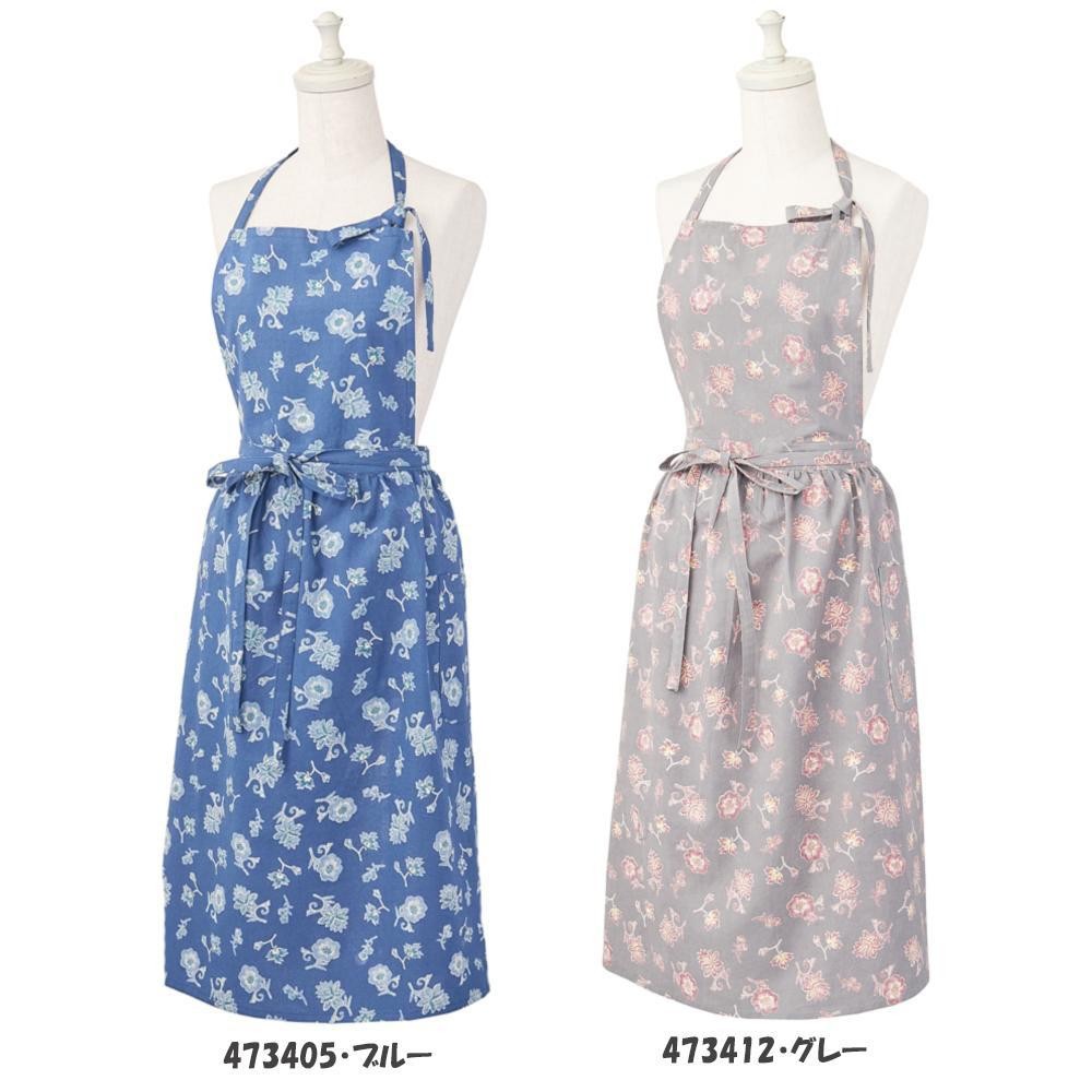 エスニック&フェミニンな更紗のプリント柄です。ほんのりギャザーが入ったエプロンは、女性らしさを引き立てます。