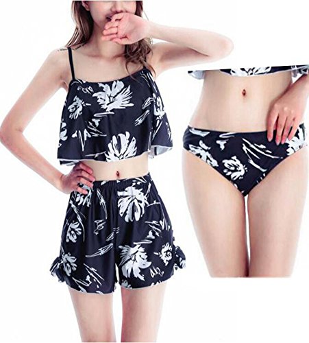 -. Title : (Bidasu)改良版 水着 レディース 花柄 水着通販 3点セット ワイヤー付き ビキニ セクシー 体型カバー ブラ 短パン ブラック 黒 フリル リボン 海水浴 温泉 A6