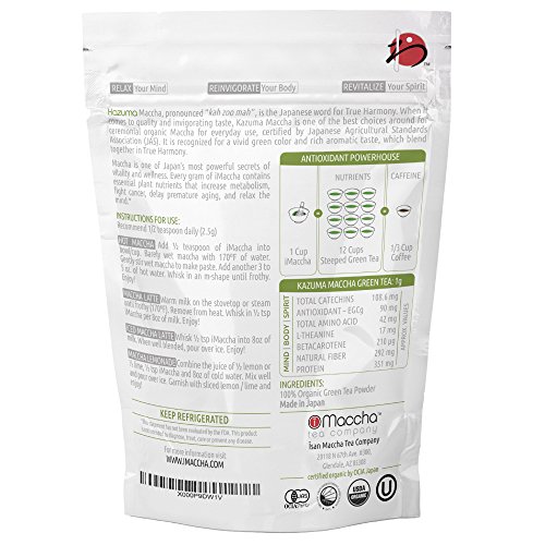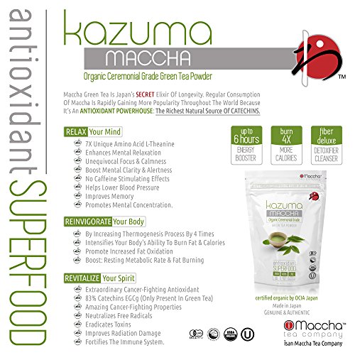 - Feature : ➤ TRUTH: WE ARE NOT CREATED EQUAL. KAZUMA green tea has been independently tested and certified, it's the most premium organic quality on the market. If It's Not iMaccha, It's Not Real Matcha At All! / ➤ INCREASE METABOLIC RATE & LEAN BODY MASS. KAZUMA green tea scored 1700 TE/g (ORAC); rich in antioxidant components known to boost metabolism, eliminate free radicals & slow the signs of aging. / ➤ YOUR SECRET WEAPON TO RELAX, REINVIGORATE & REVITALIZE YOUR BODY. KAZUMA green tea has 7X's the unique amino acid L-Theanine, known to promote relaxation without sedation & reduce anxiety. / ➤ NATURALLY ERADICATE TOXINS FROM YOUR BODY. KAZUMA green tea contains 83% of the most powerful antioxidant that exist in nature; catechin EGCg which has proven to have therapeutic properties. / ➤ HAPPY, SEXY, LEANER YOU. The perfect trifecta pre-workout drink; consume KAZUMA green tea to increase the thermogenesis process from 8-10% to 35-43%, thus increasing your body's fat-burning 4X's faster than average. Get The Body You Always Wanted - Click "Add to Cart" Now!