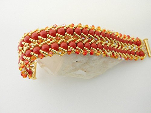 -. Title : A036-Swarovski Coral Pearls/Fire Opal Crystals Bracelet
