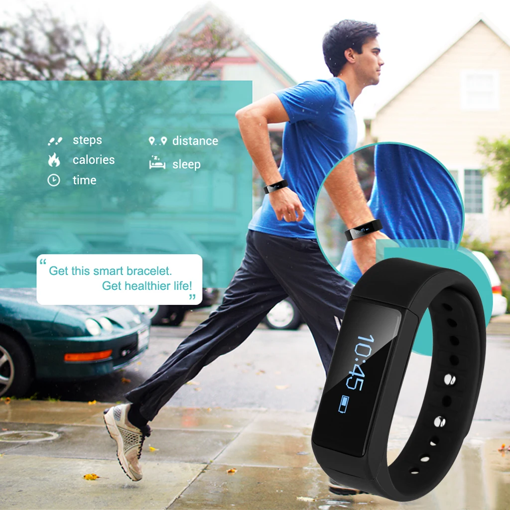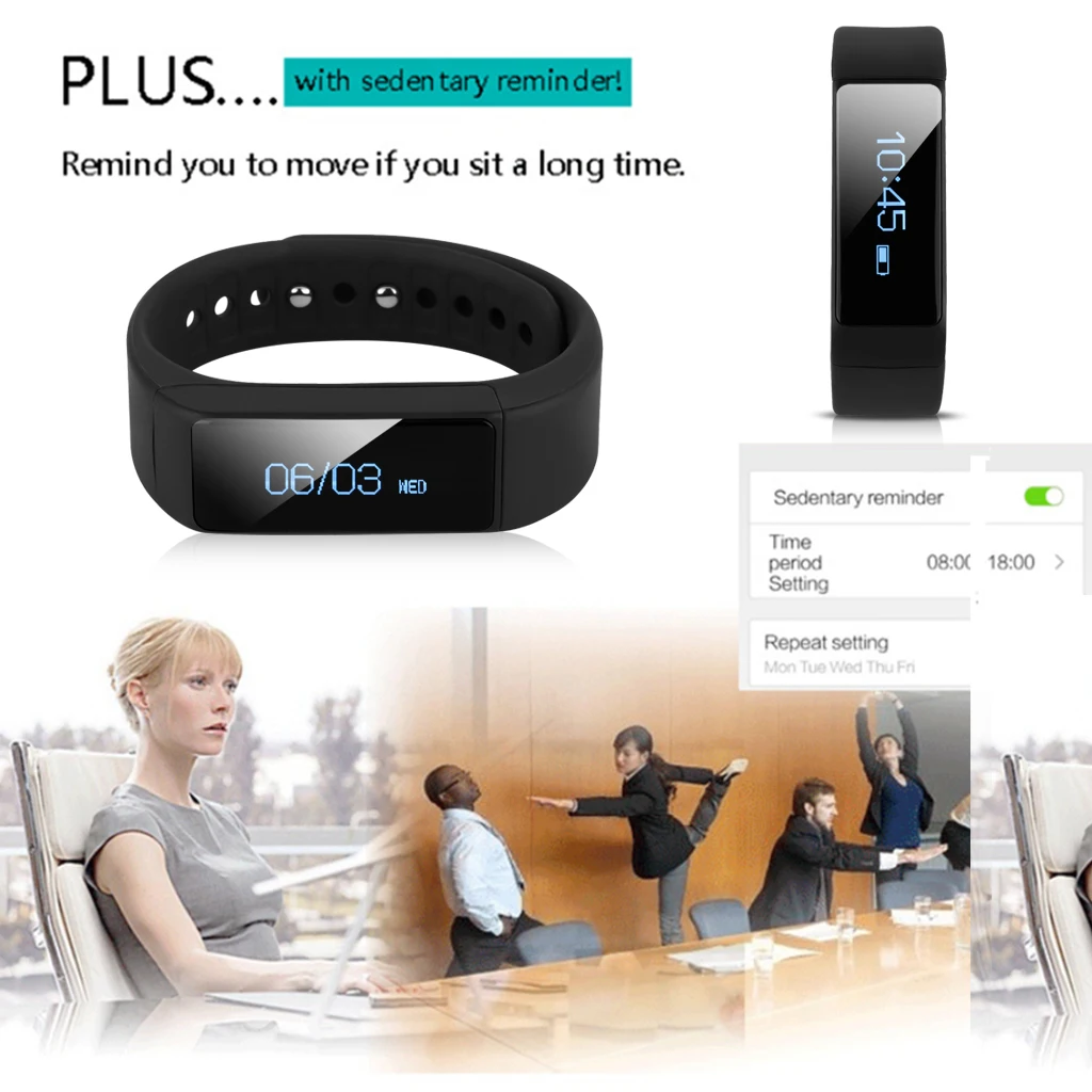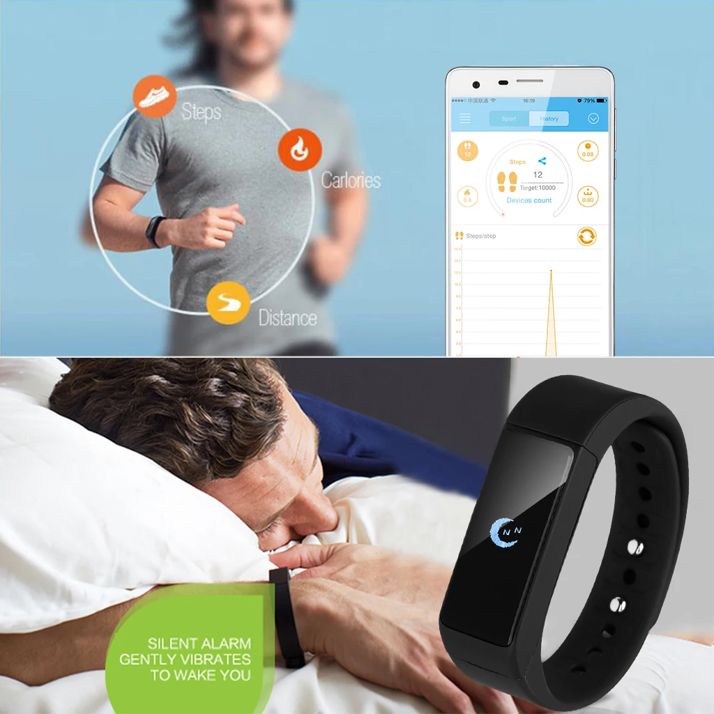 This fitness tracker?smart bracelet with OLED screen clearly displays health parameters including steps, calories, distance and time. With TPU adjustable wristband and light weight feature, you can wear it comfortably, such as running, climbing. When you do exercise, it can record your sports data. When you sleep, it can monitor your sleep. It also can wake you up by vibrating gently. All these data can be synchronized and analyzed on your smartphone.