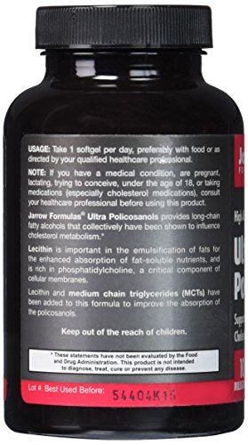 Jarrow FORMULAS Ultra Policosanols provides long-chain fatty alcohols that collectively have been shown to influence cholesterol metabolism.Lecithin is important in the emulsification of fats for enhanced nutrient absorption, and is rich in phosphatidylcholine, a critical component of cellular membranes. Lecithin and medium chain triglycerides (MCTs) have been added to this formula to improve the absorption of the policosanols.